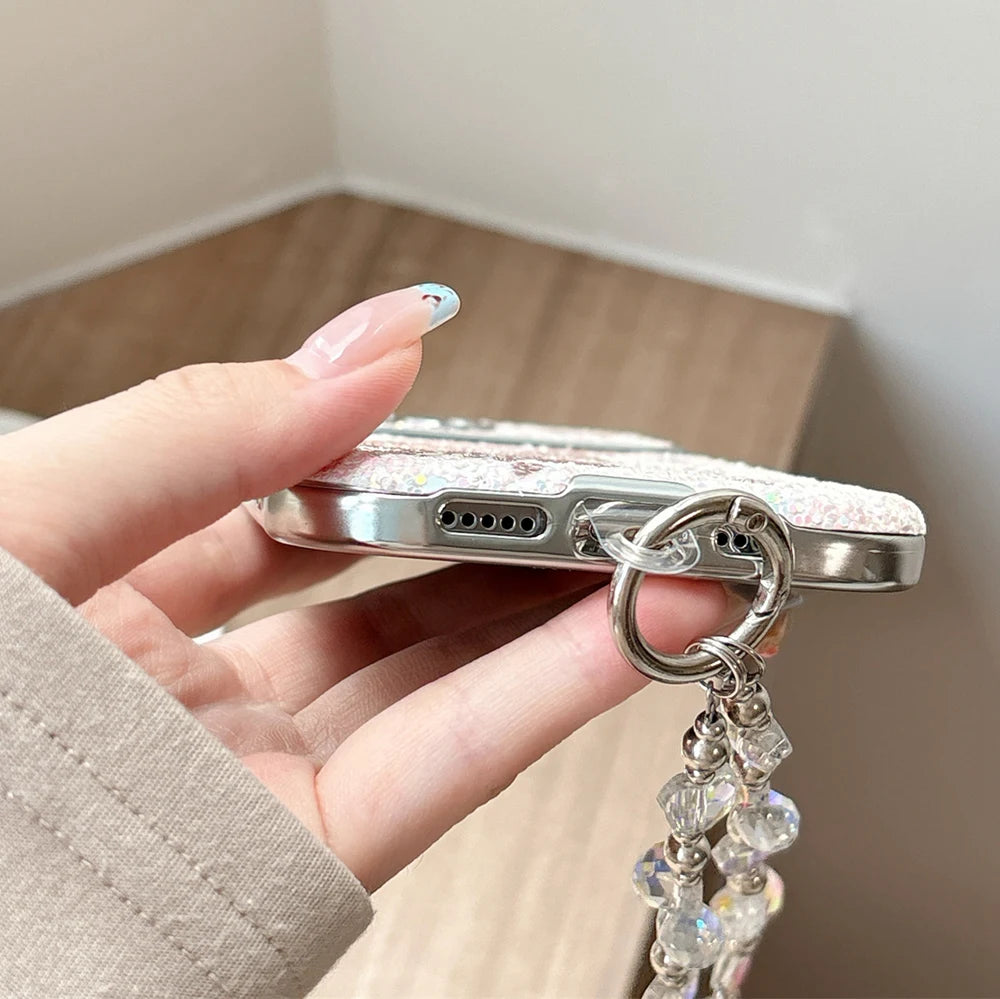 Ein besonderes Highlight ist die abnehmbare Perlen-Armbandkette, die nicht nur dekorativ wirkt, sondern auch als praktische Handschlaufe dient. Sie bietet zusätzliche Sicherheit, damit das Smartphone nicht versehentlich aus der Hand fällt.