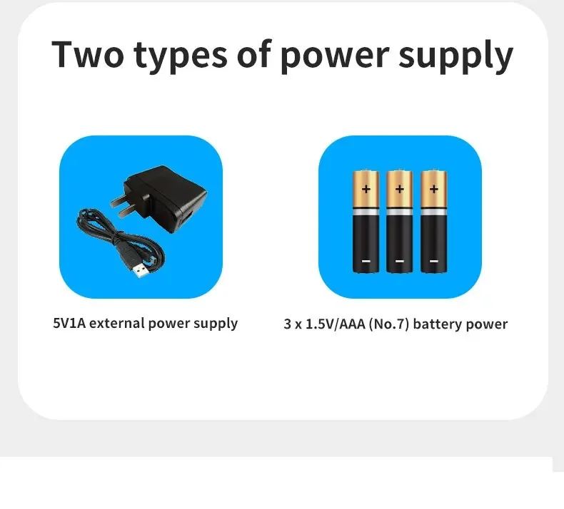 • Stromversorgung: 3 x 1,5V AAA Batterien oder 5V/1A externe Stromversorgung