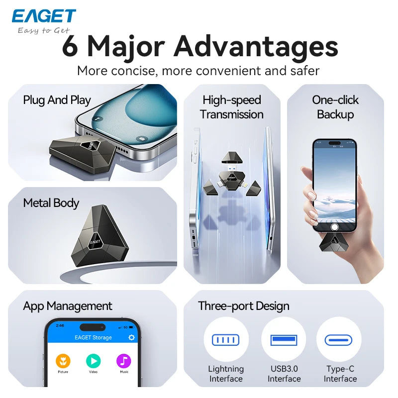 Mit Unterstützung für iOS- und Android-Geräte ermöglicht dieses Flash-Laufwerk eine schnelle Sicherung Ihrer Daten und das Verwalten von Dateien zwischen verschiedenen Geräten. Für iPhone-Nutzer bietet es eine direkte Verbindung für iOS-Backups, ohne dass ein Kabel benötigt wird. Laden Sie einfach die App herunter, um das Backup direkt zu starten und Speicherplatz auf Ihrem Gerät freizugeben.