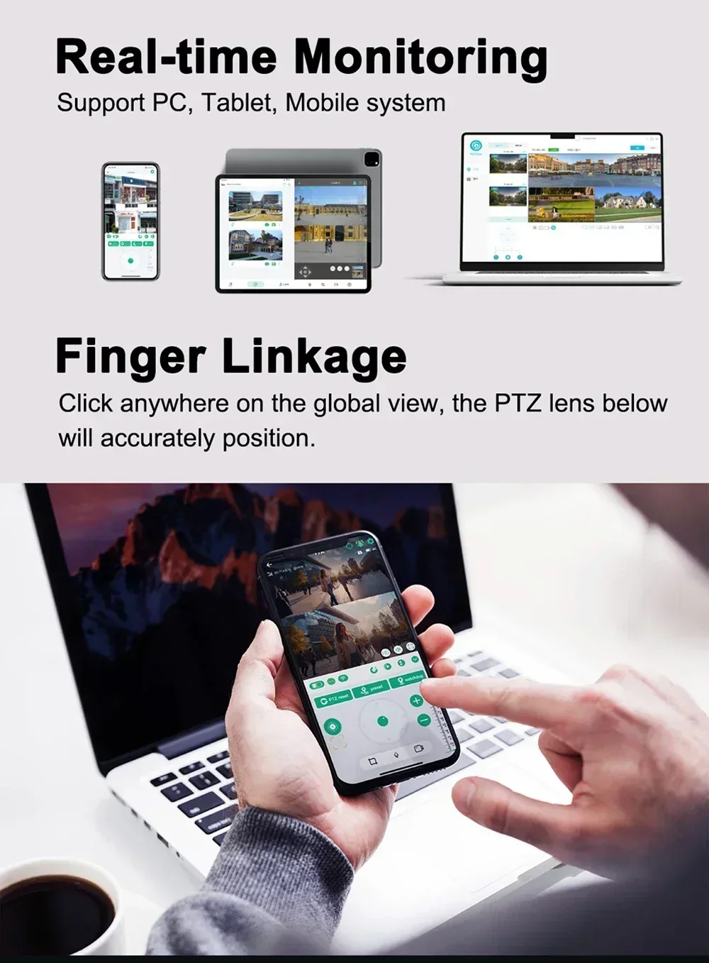 Die Kamera unterstützt menschliche Erkennung durch PIR-Sensoren, die präzise Bewegungen erkennen und Fehlalarme reduzieren. Automatische Verfolgung sorgt dafür, dass sich bewegende Personen zuverlässig im Blickfeld bleiben. Dank IP66 Schutz ist die Kamera gegen Staub und Wasser geschützt und somit ideal für den Einsatz im Freien, selbst bei extremen Wetterbedingungen von -20 °C bis 50 °C.