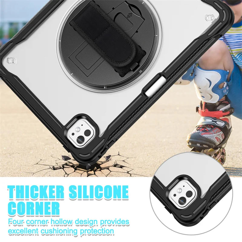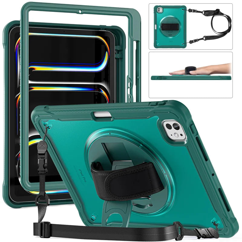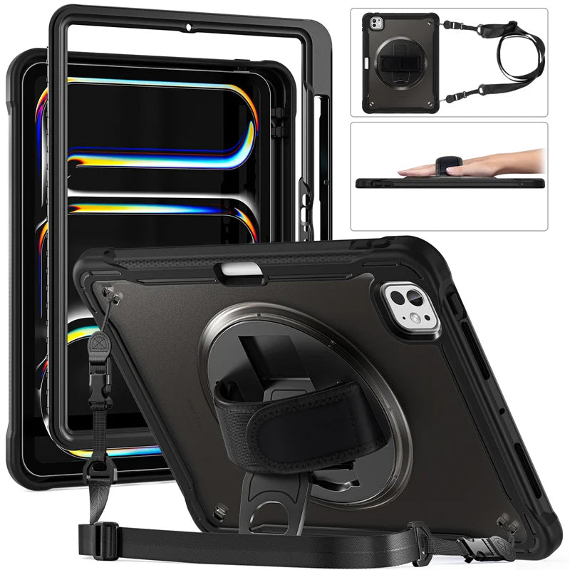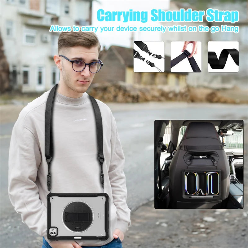 Die Hülle ist kompatibel mit iPad Pro 11", 12.9" und 13" 2024, iPad Air 11" 4./5. Generation, iPad 10"/10.9"/10.2", iPad 9./8./7. Generation sowie iPad 11. Generation. Dank des integrierten Riemens lässt sich das Tablet einfach tragen oder sicher befestigen.