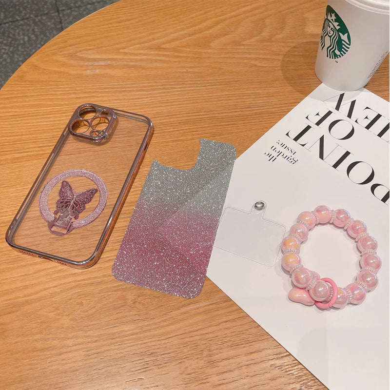 Hergestellt aus hochwertigem, flexiblem TPU-Silikon bietet die Hülle optimalen Schutz bei gleichzeitig angenehmem Tragegefühl. Der feine Glitzer-Look kombiniert mit einem Schmetterlingsdesign macht jedes Smartphone zu einem Blickfang. Die integrierte Halterung sowie das passende Armband sorgen für mehr Komfort im Alltag – ideal für Reisen, Shopping oder Treffen mit Freunden.