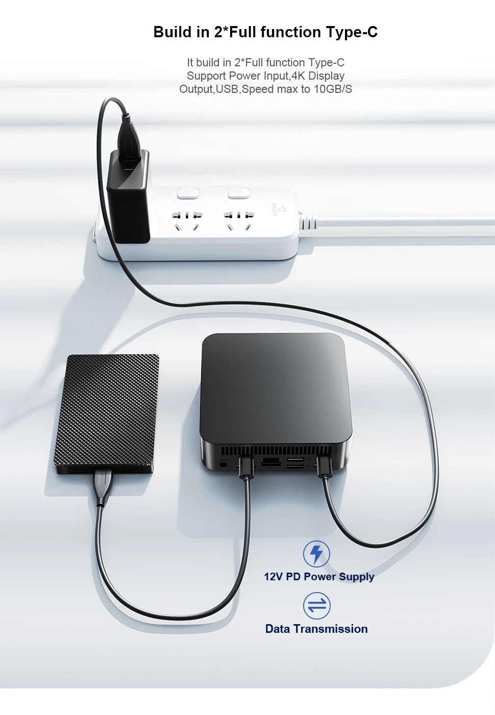 Die integrierte Grafikkarte sorgt für klare und scharfe Darstellungen, unterstützt 4K-Ausgabe bei 60 Hz und liefert ein lebendiges Bild, das besonders für Multimedia-Anwendungen und visuelle Aufgaben von Vorteil ist. Das Gerät ist mit einem voll funktionsfähigen Type-C-Anschluss ausgestattet, der nicht nur schnelle Datenübertragung, sondern auch vielseitige Anschlussmöglichkeiten bietet. Zudem ist der Mini PC besonders klein und leicht, sodass er problemlos in jeder Arbeitsumgebung Platz findet.