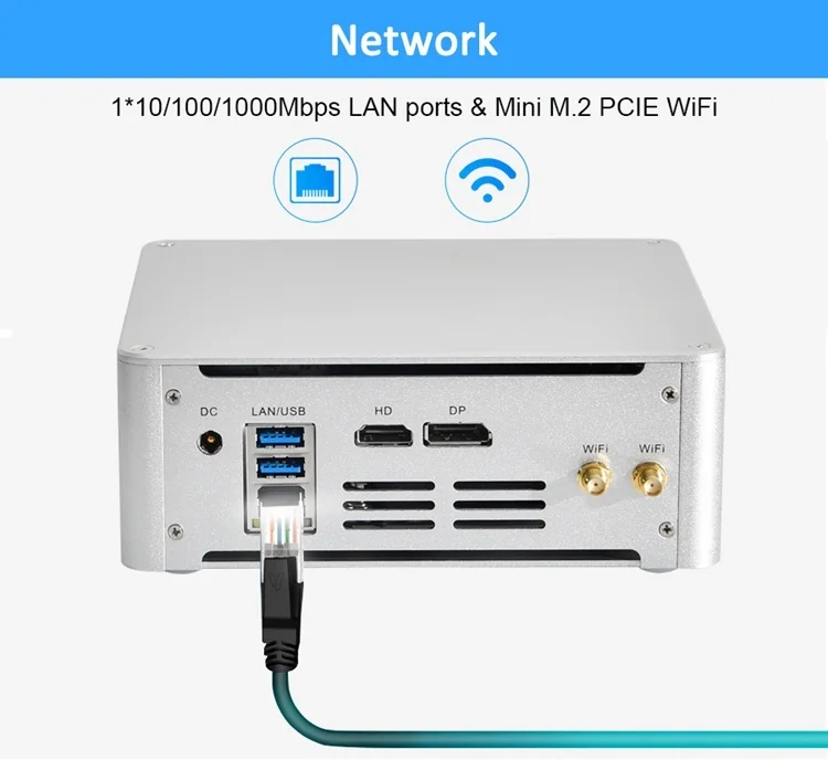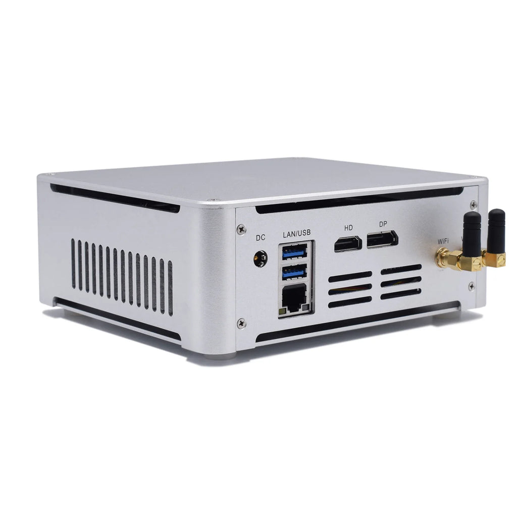 Der Mini-PC verfügt über integrierte Intel UHD Graphics und bietet stabile Netzwerkverbindungen dank Gigabit LAN (RJ45). WLAN und Bluetooth sind in den entsprechenden Bundles enthalten. Das kompakte Gehäuse aus Aluminium misst nur 160 x 150 x 65 mm und wiegt lediglich 0,8 kg – ideal für kleine Arbeitsplätze oder als platzsparende Lösung im Homeoffice.