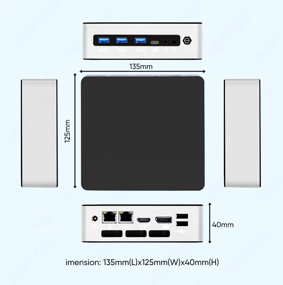 Der Mini PC wird mit Windows 11 Pro vorinstalliert geliefert (ausgenommen Barebone-Modelle ohne RAM und SSD). Der flüsterleise Kupfer-Turbo-Lüfter sorgt für eine effiziente Kühlung auch bei hoher Auslastung.