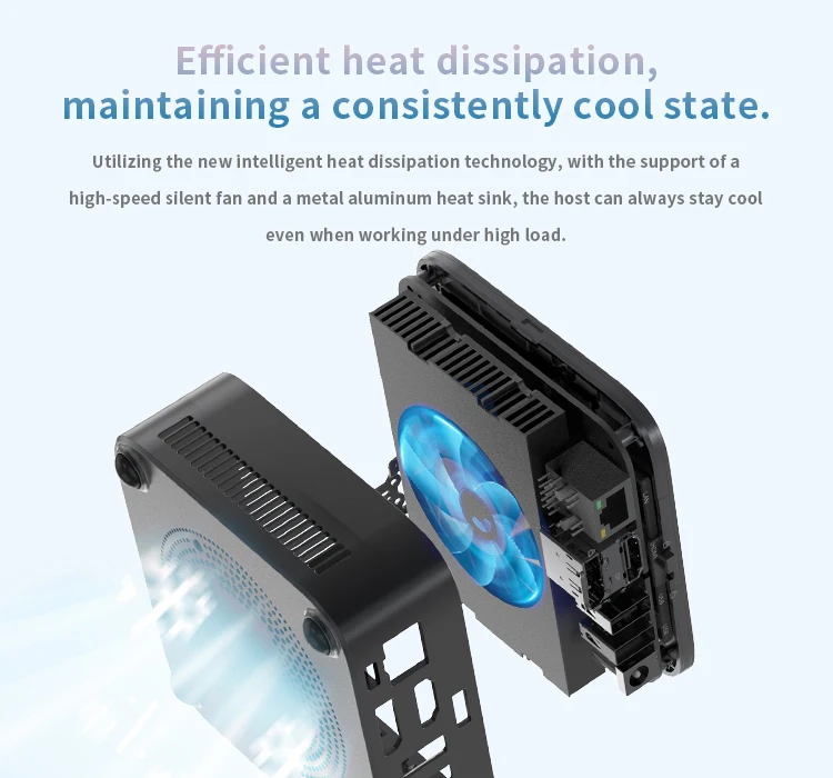 Für optimale Leistung sorgt eine intelligente Wärmeableitung mit einem leisen Hochgeschwindigkeitslüfter und einem Metall-Kühlkörper, der das System auch bei längeren und intensiven Arbeitsphasen kühl hält. Die Energieeffizienz ist hoch, wodurch der Mini-PC einen niedrigen Stromverbrauch hat und somit ideal für den Dauerbetrieb geeignet ist.