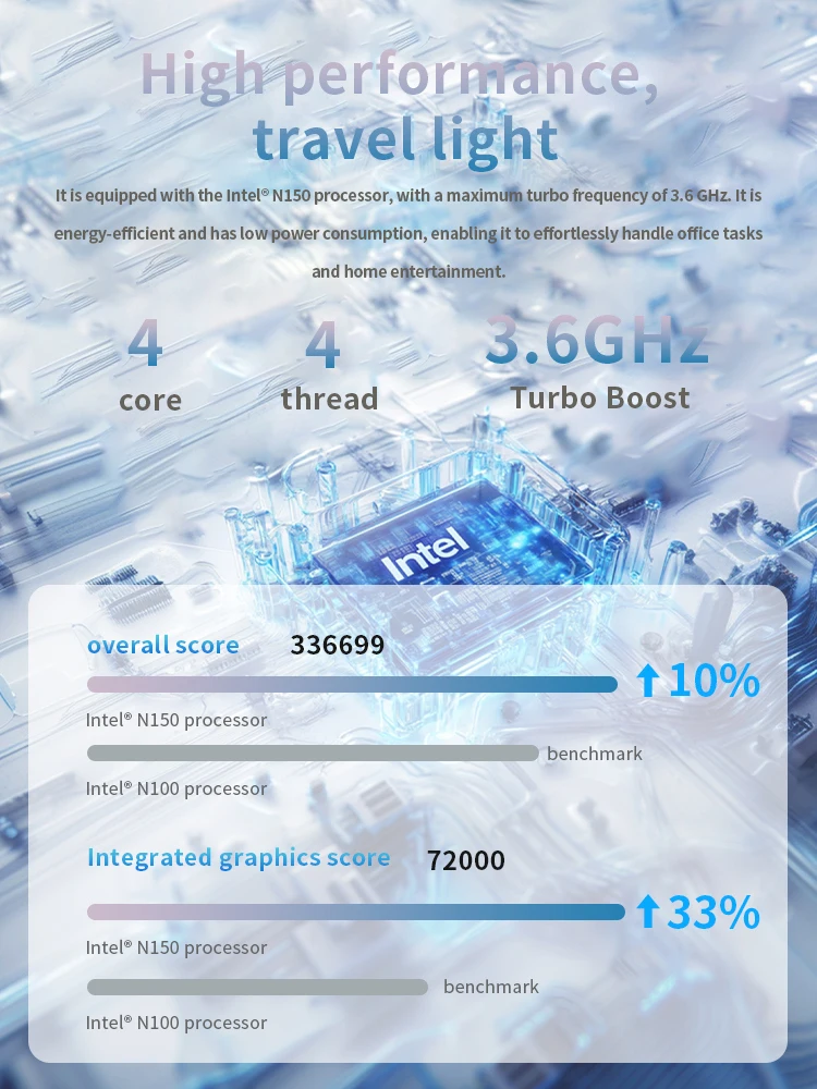 Dieser kompakte Mini-PC ist mit einem leistungsstarken Intel N150 Prozessor ausgestattet, der mit bis zu 3,6 GHz Turbofrequenz für eine schnelle und reibungslose Verarbeitung sorgt. Er eignet sich ideal für den Einsatz zu Hause, im Büro oder für Spiele, da er auch bei intensiven Aufgaben stabil und effizient arbeitet.