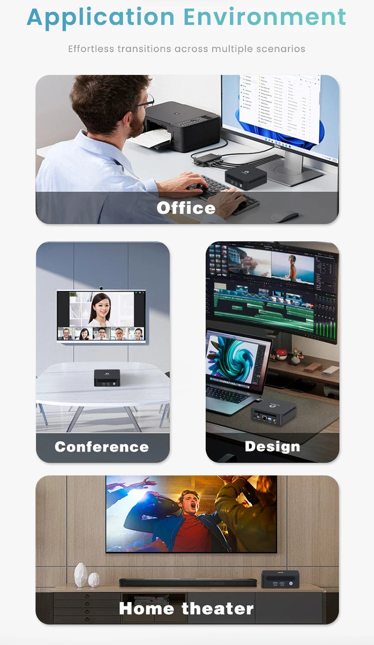 Der Mini PC ist besonders platzsparend gebaut und passt auf jeden Schreibtisch oder kann sogar hinter einem Monitor montiert werden. Er verfügt über diverse Anschlussmöglichkeiten wie USB 3.2, HDMI und Ethernet, um verschiedene Peripheriegeräte anzuschließen und eine stabile Netzwerkverbindung zu gewährleisten.