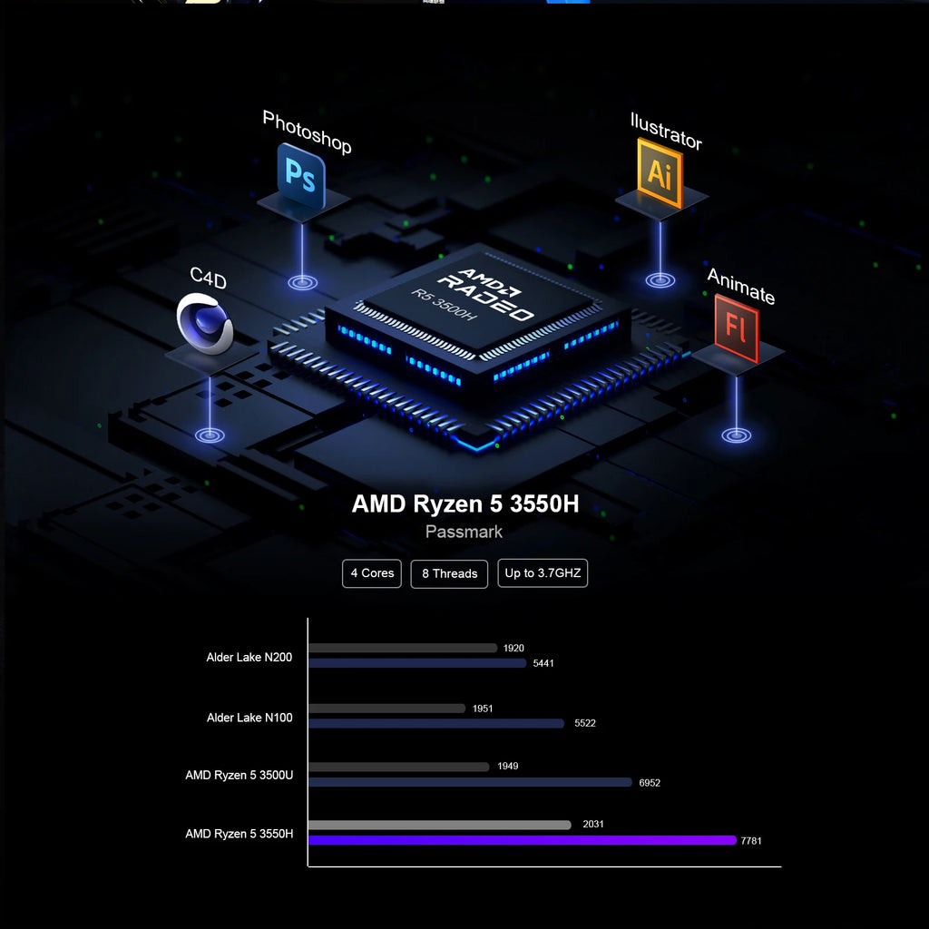 Der Mini-PC ist eine kompakte und leistungsstarke Lösung für den Haushalt und vielseitige Multimedia-Anwendungen. Ausgestattet mit einem AMD R5 3550H Prozessor mit einer Basistaktung von 2,1 GHz, bietet das Gerät eine solide Leistung für alltägliche Aufgaben, Medienwiedergabe und leichte Gaming-Anwendungen.