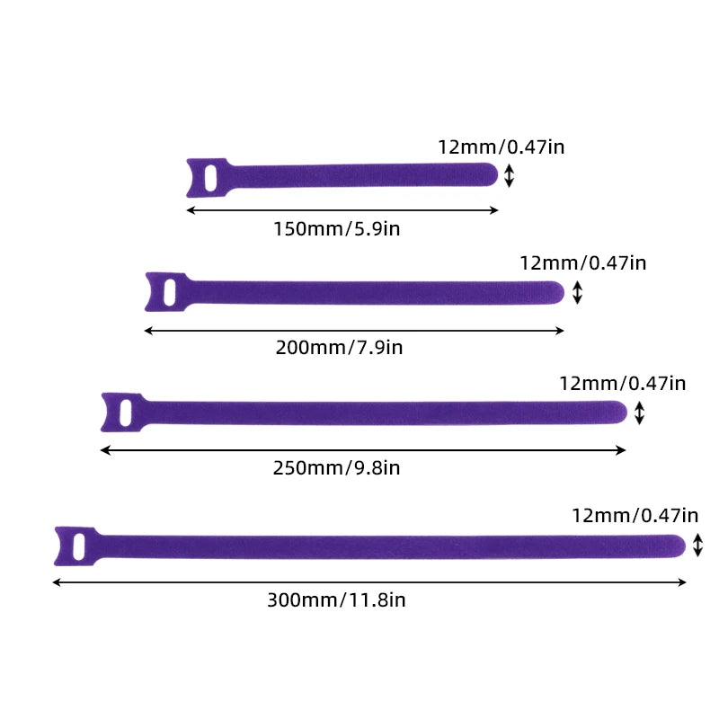 Lila wiederverwendbare Nylon-Kabelbinder in verschiedenen Längen (150 mm, 200 mm, 250 mm, 300 mm) für eine einfache und ordentliche Kabelorganisation. Diese flexiblen Kabelbinder eignen sich perfekt, um alle Arten von Kabeln, Drähten oder Ladegeräten sicher zu bündeln und ein Kabelchaos zu vermeiden. Sie bestehen aus robustem Nylon und Polyester, was für Langlebigkeit und wiederholte Nutzung sorgt.