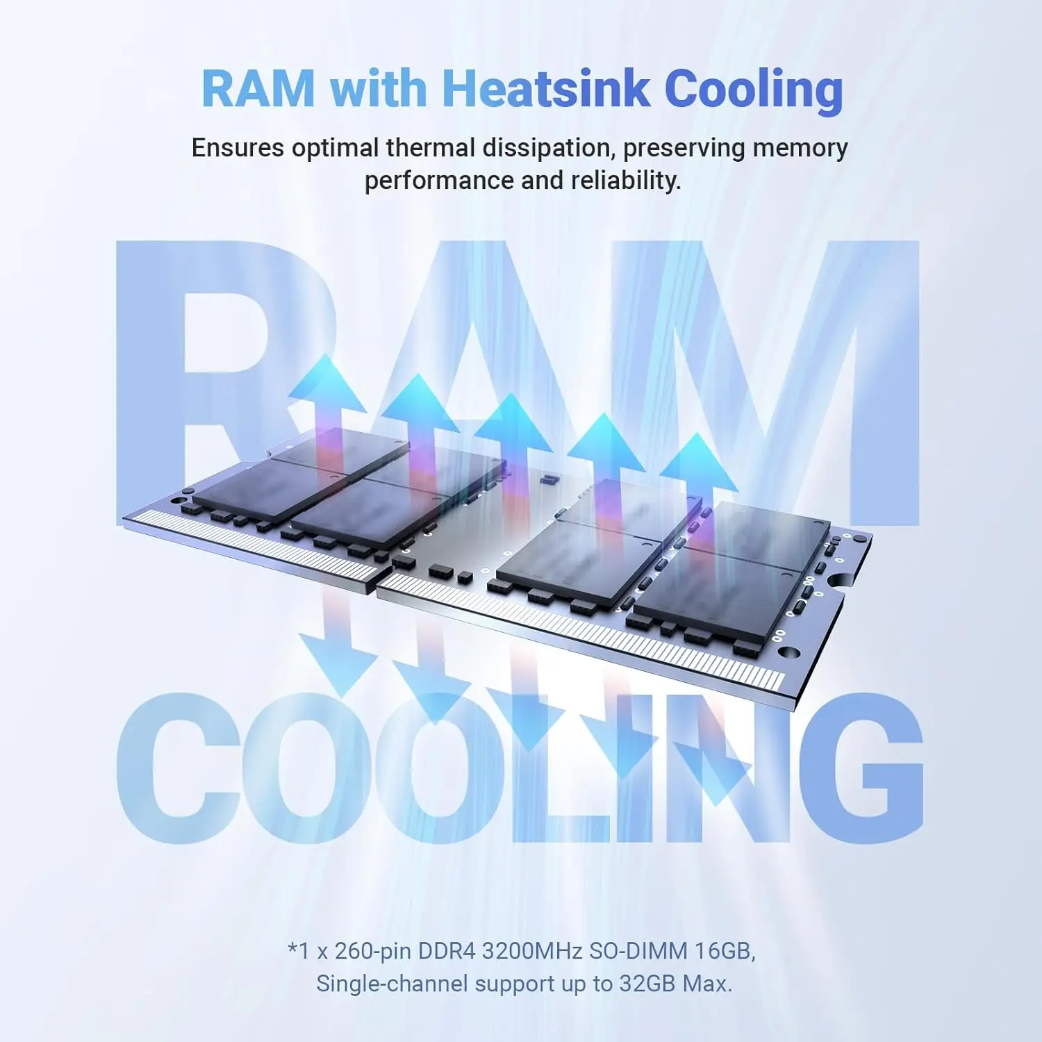 Der Mini-PC verfügt über 2,5 Gigabit Ethernet für schnelle und stabile Netzwerkverbindungen sowie WLAN 802.11ax (Wi-Fi 6) mit dualen Bändern (2,4 GHz und 5 GHz) für kabellosen Internetzugang. Zusätzlich stehen USB 3.2 und USB-C Anschlüsse zur Verfügung, die eine flexible Verbindung zu externen Geräten ermöglichen.