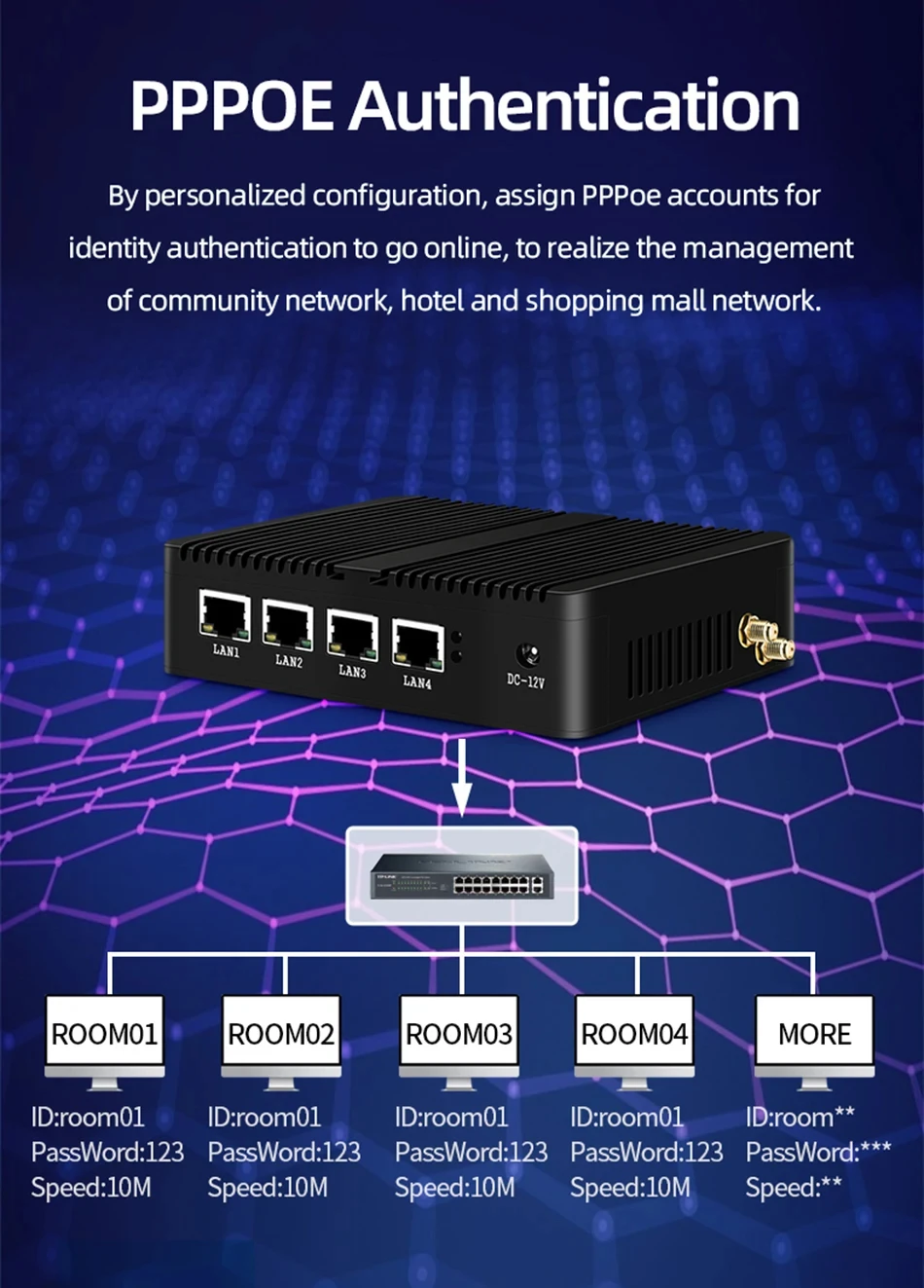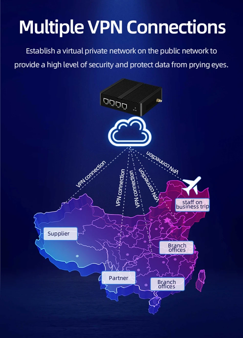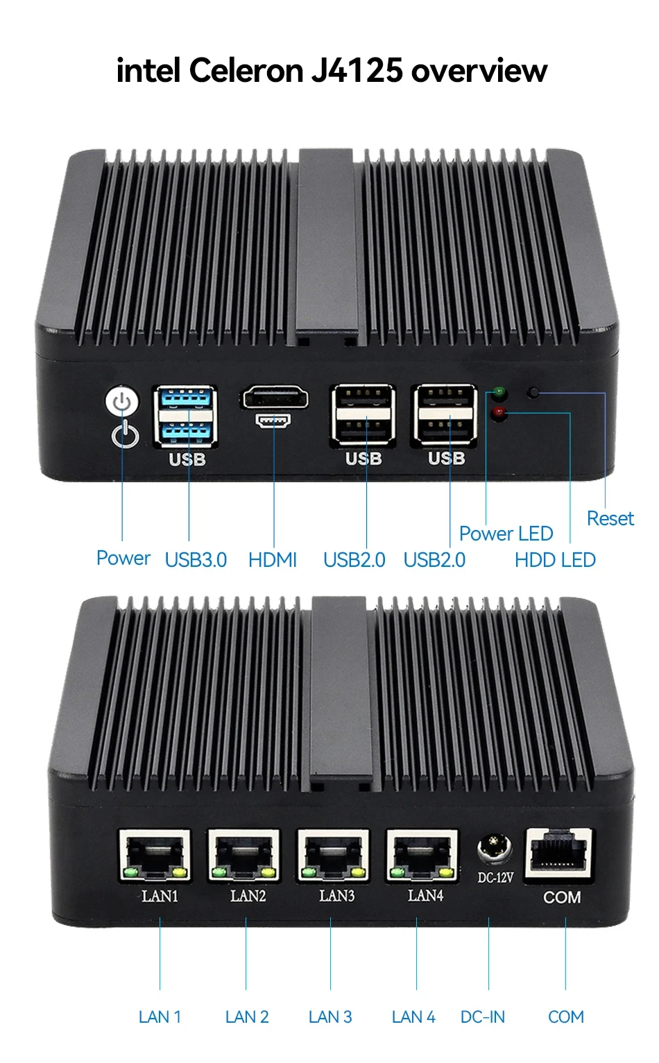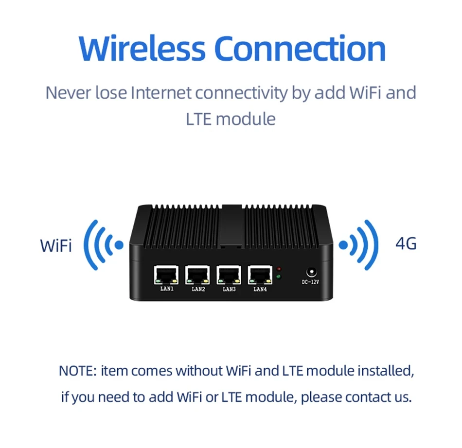 Mit vier Intel i225V Gigabit-LAN-Ports eignet sich das Gerät perfekt für Anwendungen wie pfSense, OPNsense, OpenWrt oder andere Firewall- und Router-Systeme. Dank Unterstützung für PXE und Wake-on-LAN (WOL) lässt sich der Mini-PC auch in anspruchsvollen Netzwerkumgebungen flexibel integrieren.
