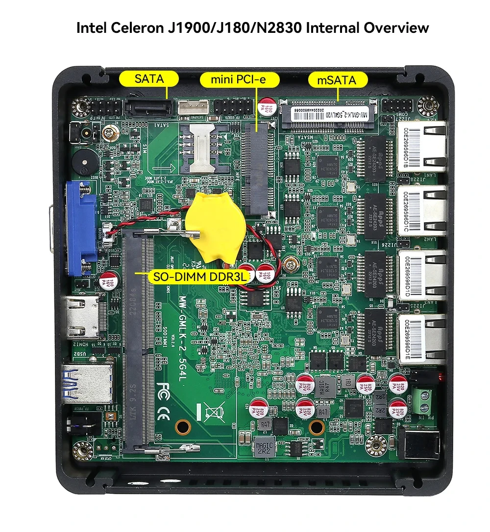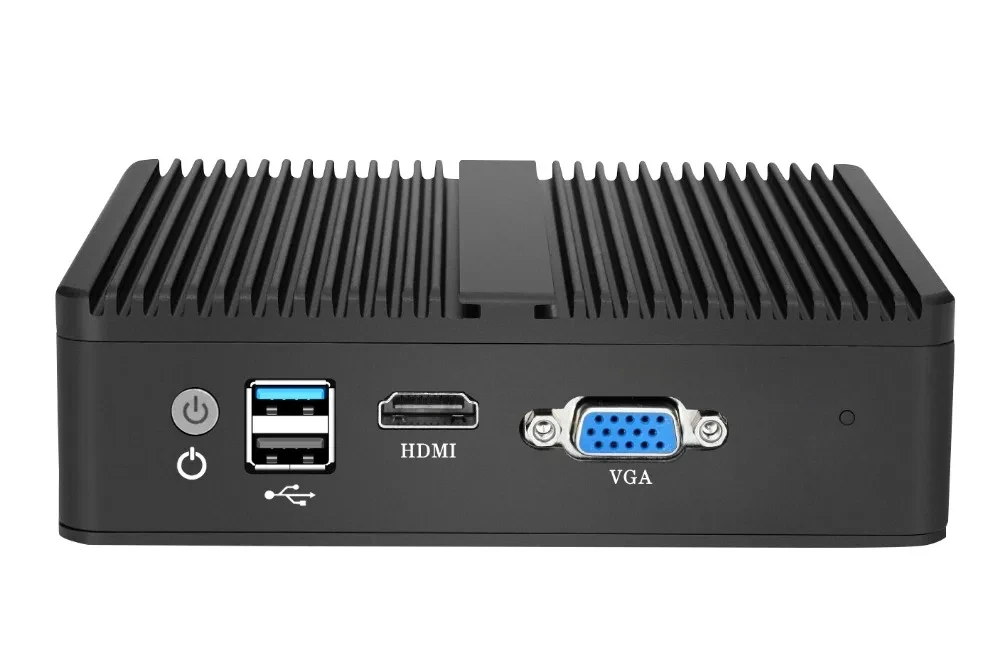 Kompakter lüfterloser Industrie-Mini-PC mit Intel J1900, 4x i225V LAN, HDMI, VGA, USB – Ideal für Windows, Linux & pfSense