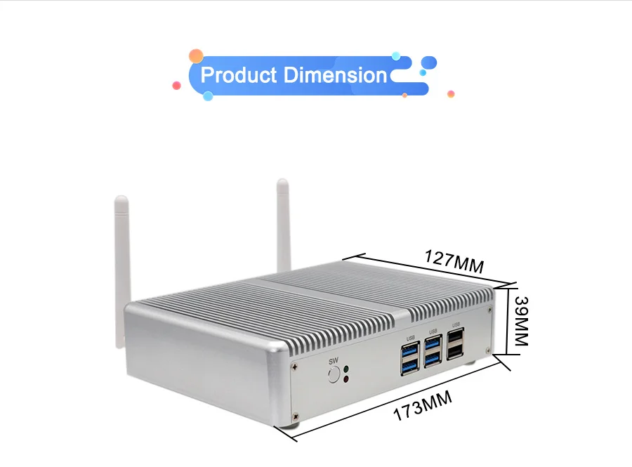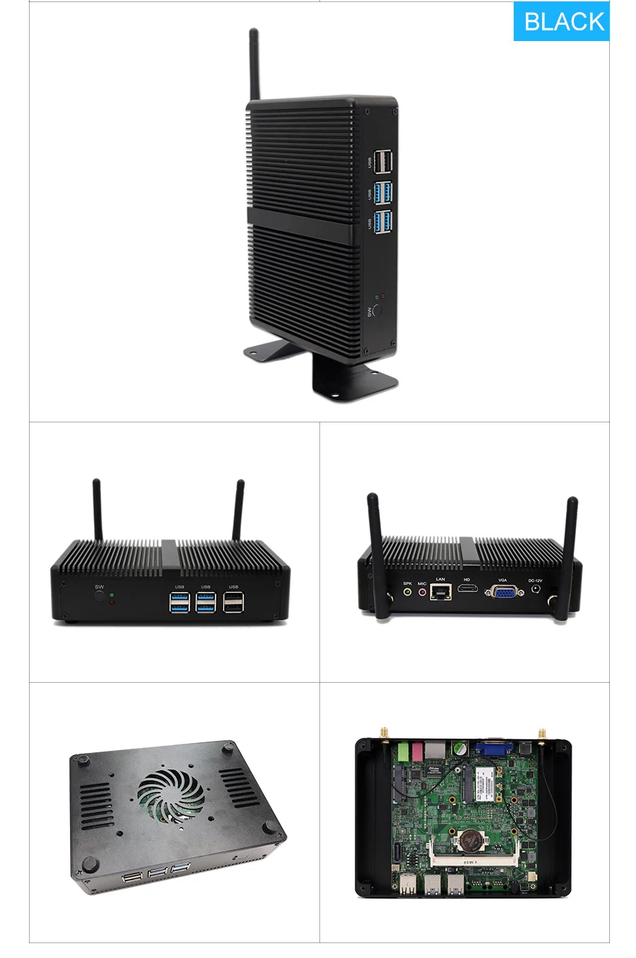 Zwei Videoausgänge (HDMI und VGA) erlauben den Anschluss an klassische Monitore oder Projektoren. Ein RJ45-Gigabit‑LAN-Anschluss ermöglicht schnelle kabelgebundene Verbindungen. Zusätzliche USB-Ports (4× USB 3.0, 2× USB 2.0) bieten ausreichend Schnittstellen für Peripheriegeräte. Das Gerät misst nur 173 × 127 × 39 mm und ist wahlweise in schwarz, silber oder blau erhältlich. Mit seiner passiven bzw. nahezu geräuschlosen Konstruktion ist der M3 leise genug für ruhige Arbeitsumgebungen.