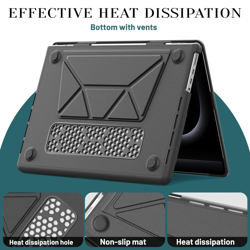 Das einzigartige Bodendesign sorgt für Stabilität und verhindert ein Verrutschen. Die integrierten Lüftungsschlitze an der Unterseite gewährleisten eine effektive Wärmeableitung, sodass Ihr Gerät auch bei längerer Nutzung kühl bleibt. Durch präzise Ausschnitte sind alle Anschlüsse, Tasten und Ports leicht zugänglich.