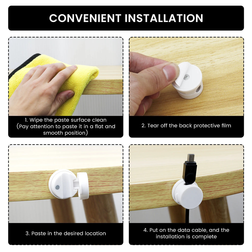 Das drehbare Design erlaubt eine flexible Anpassung der Kabelrichtung, ohne dass die Kabel beschädigt werden. Die Installation ist besonders einfach: Mit dem aufgeklebten Acrylkleber auf der Rückseite kann der Organizer schnell und ohne Werkzeug angebracht werden. Das kompakte, platzsparende Design ermöglicht eine unauffällige Kabelorganisation, die in verschiedenen Umgebungen gut eingesetzt werden kann.
