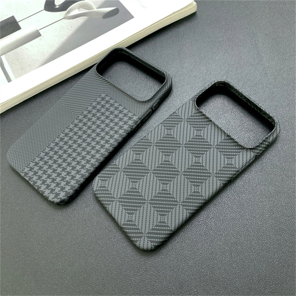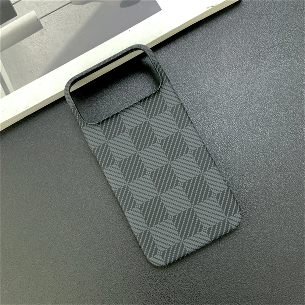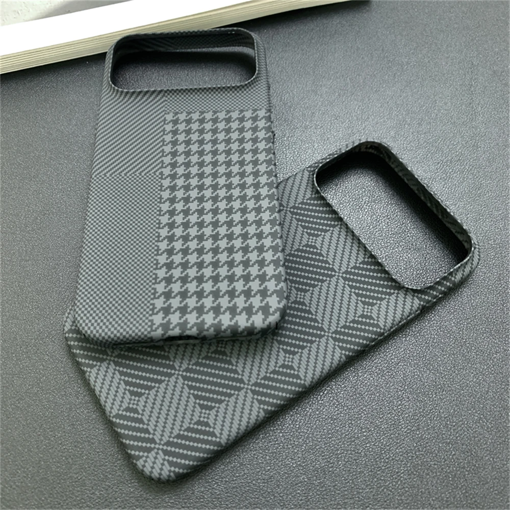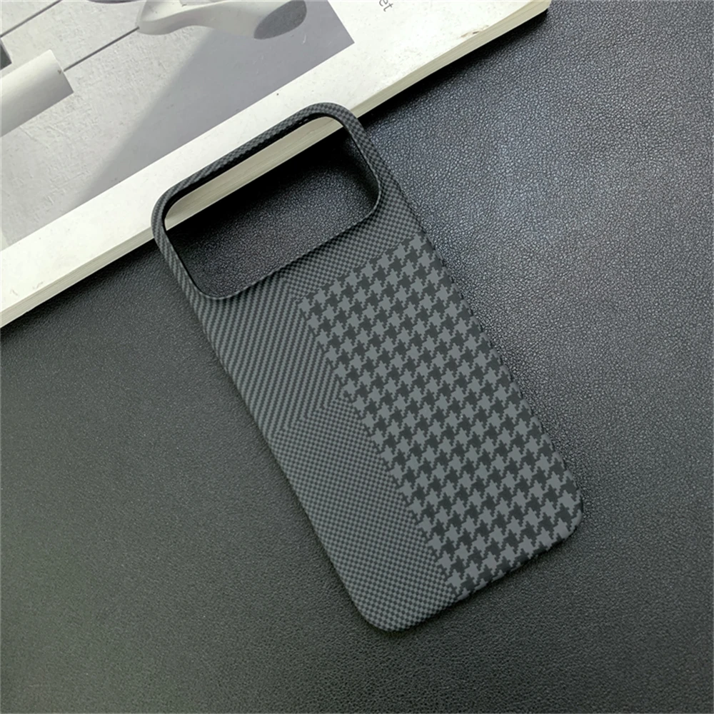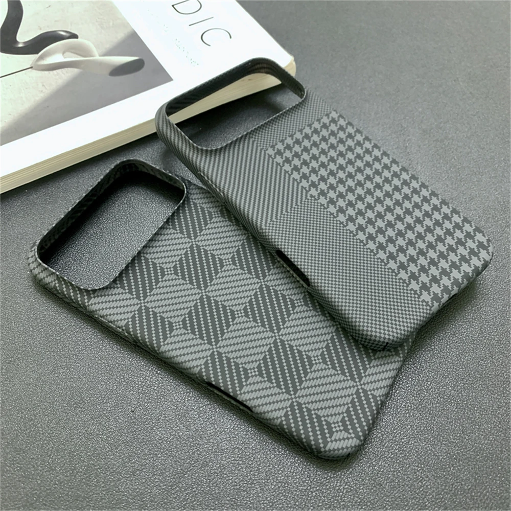Schlanke, matte Kohlefaserhülle mit luxuriösem Karomuster und kontrastfarbener Stoßstange – elegante Premium-Schutzhülle für stilvollen Rundumschutz