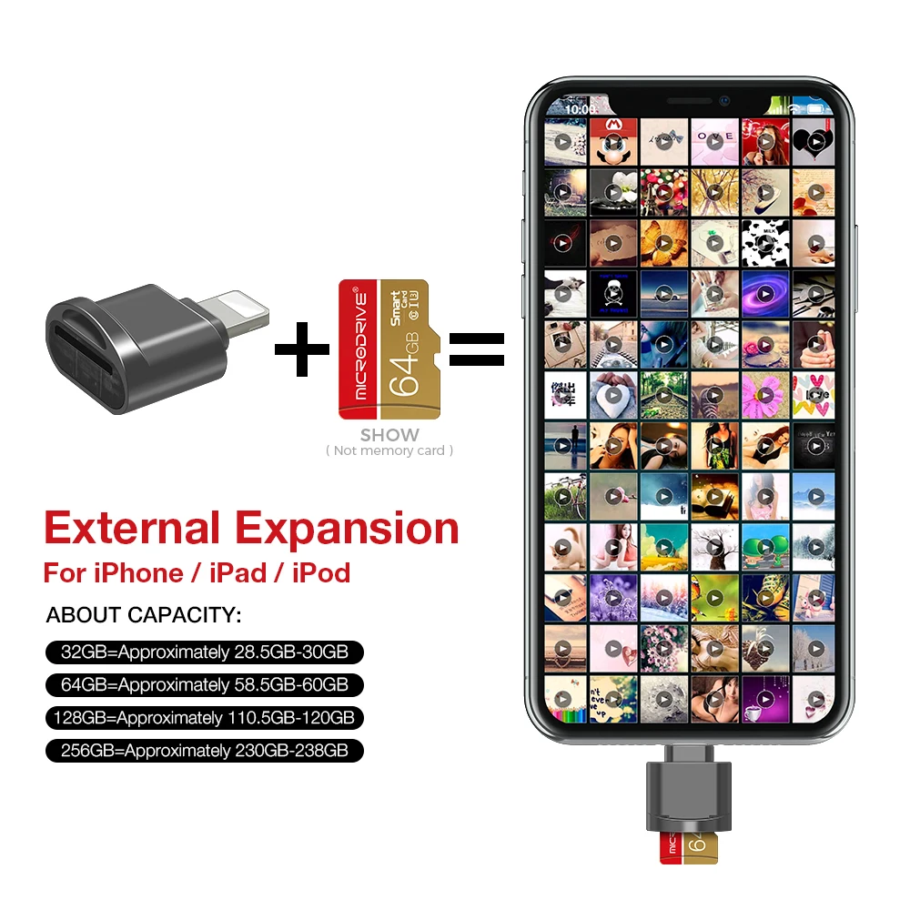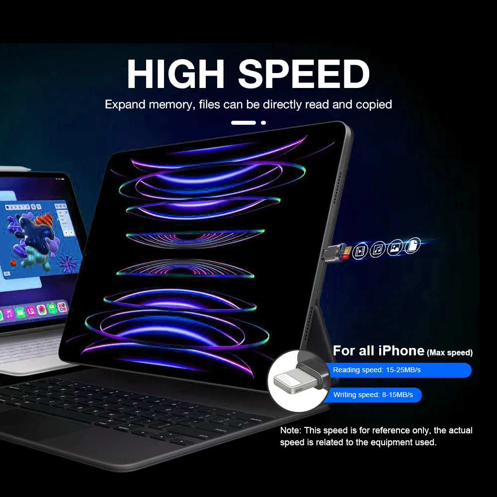 Kompatibel mit allen iPhone- und iPad-Modellen mit Lightning- oder USB-C-Anschluss. Unterstützt die Übertragung von SD, Mini SD, Micro SD und TF Karten. Die Installation ist einfach: Karten einlegen, den Adapter in das Gerät stecken und die Dateien direkt abrufen.