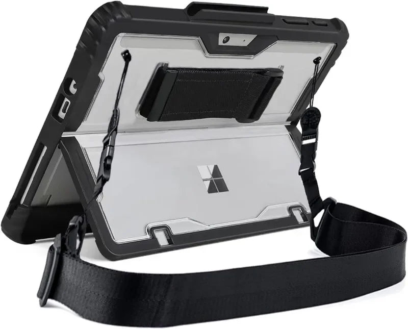 Die Hülle ist kompatibel mit offiziellen Microsoft Tastaturen und verfügt über ein spezielles Öffnungsdesign sowie fest verschließbare Schnallen, die den Bildschirm schützen, wenn die Tastatur nicht verwendet wird. Außerdem ist eine Handschlaufe enthalten, die die Handhabung noch komfortabler macht.