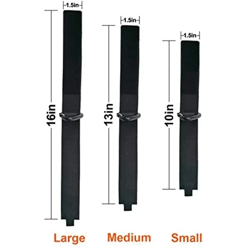 Die Organizer-Straps sind in drei Größen erhältlich: 16 Zoll (ungefaltet), 13 Zoll und 10 Zoll, mit einer Breite von 1,5 Zoll. Sie ermöglichen das Bündeln von Verlängerungskabeln, Gartenschläuchen oder anderen großen Kabeln und Schläuchen und sorgen für Ordnung und Sicherheit im Alltag.