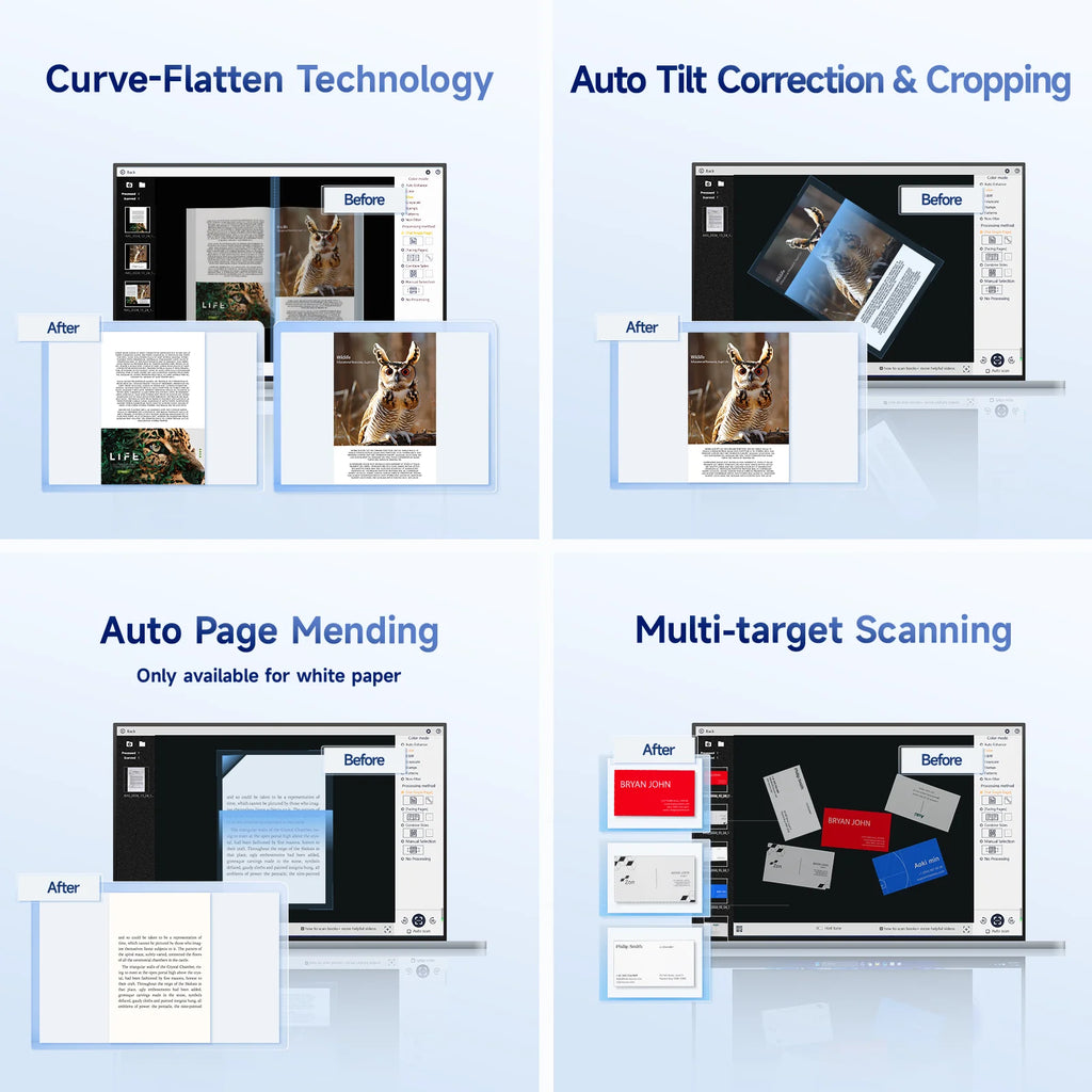 Die integrierte flache Kurventechnologie sorgt dafür, dass gewölbte Buchseiten automatisch korrigiert werden, sodass keine Verzerrungen mehr entstehen. Innerhalb von nur 1 Sekunde pro Seite wird ein Scan erstellt – das spart wertvolle Zeit und erhöht die Produktivität.