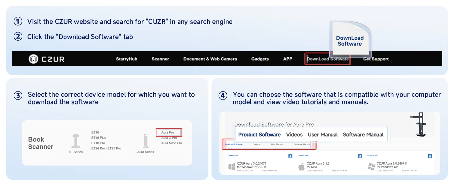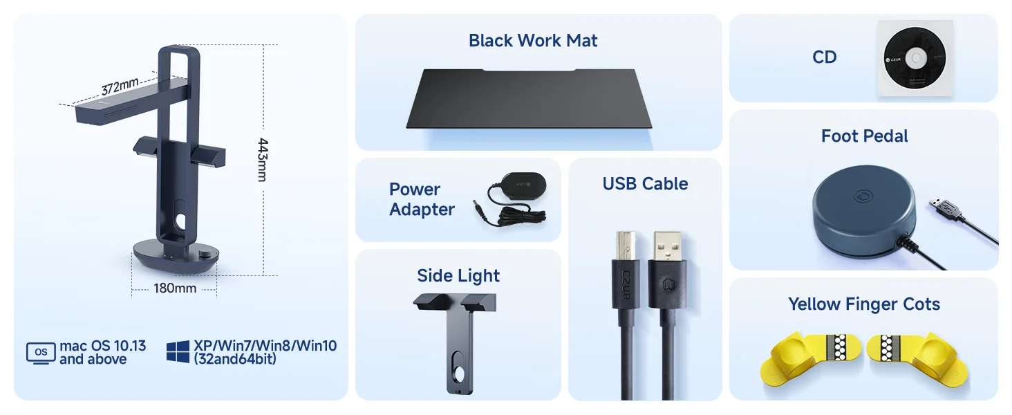 Das Paket beinhaltet neben dem Scanner auch praktische Zubehörteile wie Seitenlicht, Fußpedal, schwarze Arbeitsmatte, Fingerlinge und ein USB-Kabel. Die Software ist kompatibel mit Windows XP, 7, 8, 10 (32/64 Bit) sowie macOS ab Version 10.11.