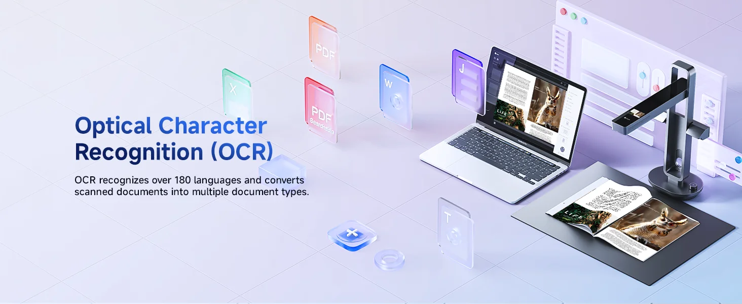 Der Scanner verfügt über eine integrierte LED-Lichtquelle sowie natürliches Licht, was eine optimale Ausleuchtung beim Scannen gewährleistet. Die OCR-Funktion unterstützt über 180 Sprachen, wodurch Texte zuverlässig erkannt und in editierbare Formate wie Word, Excel oder durchsuchbare PDFs umgewandelt werden können.