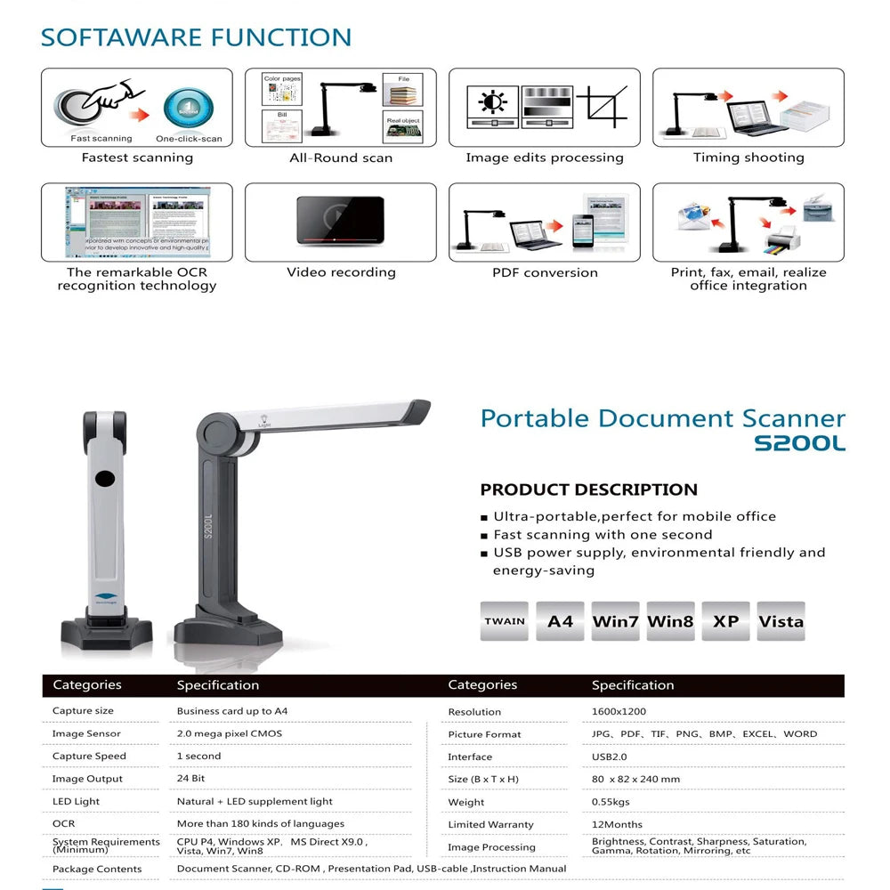 Der tragbare Hochgeschwindigkeits-Dokumentenscanner S200L ist ein innovatives und umweltfreundliches Bürogerät, das mit seiner schnellen Scanzeit von nur einer Sekunde Effizienz und Mobilität vereint. Mit einer 2-Megapixel-CMOS-Kamera und einer Auflösung von 1600 x 1200 Pixeln scannt das Gerät Dokumente bis zur Größe A4 präzise und detailreich. Der Scanner unterstützt verschiedene Bildformate wie JPG, TIF, PDF, BMP, TGA, PCX, PNG und RAS sowie Dokumentformate wie PDF, Word und TXT.