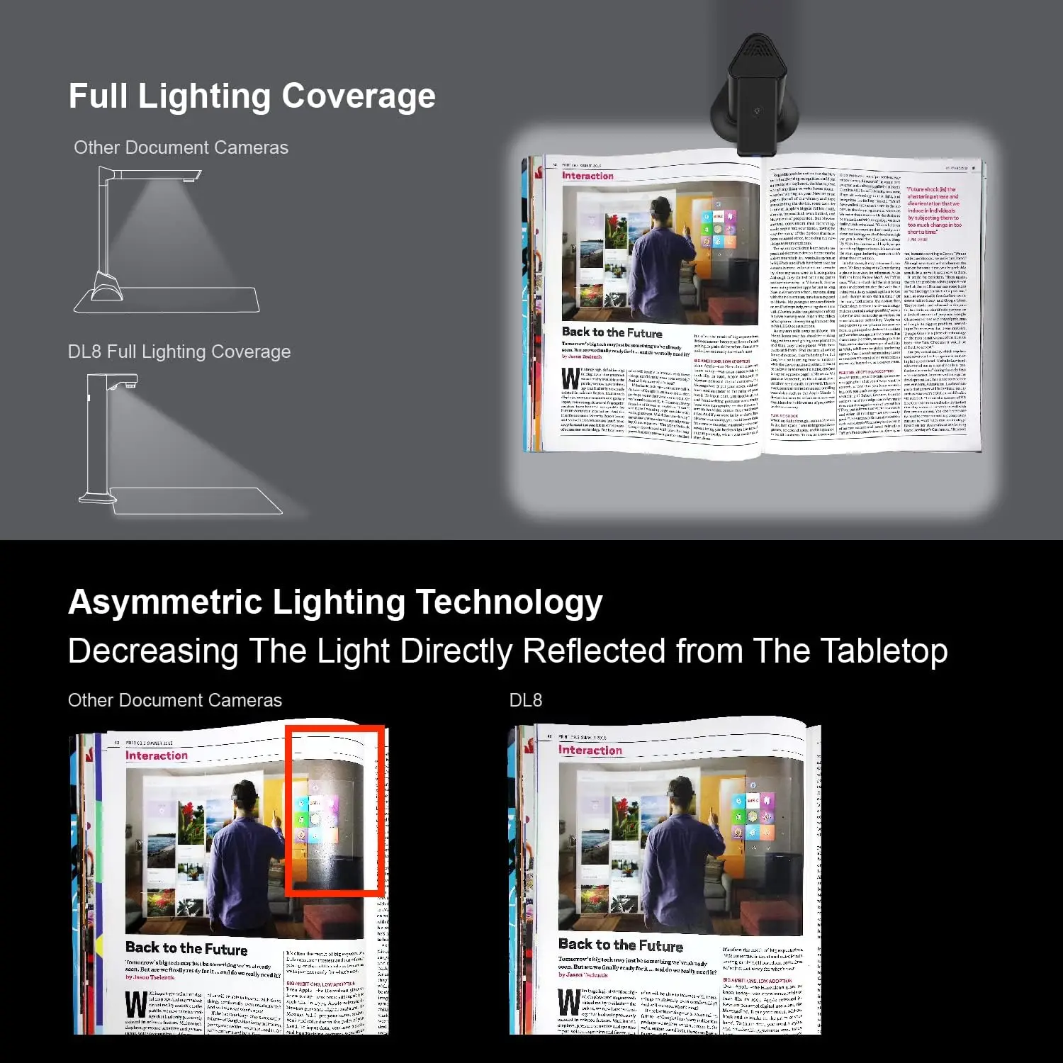 Für eine optimale Ausleuchtung sorgt eine innovative asymmetrische LED-Beleuchtung, die den gesamten Scanbereich gleichmäßig beleuchtet und Reflexionen von der Tischoberfläche minimiert. Dies garantiert eine klare Sicht auf die Dokumente auch bei schlechten Lichtverhältnissen und sorgt für eine angenehme Arbeitsumgebung.