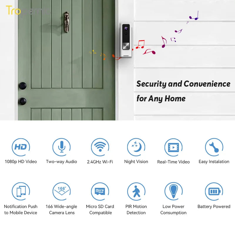 Die Tropernic Smart WiFi Video-Türklingel bietet eine zuverlässige Sicherheitslösung für Ihr Zuhause. Mit einer wasserdichten und kabellosen Bauweise ist sie ideal für den Außenbereich geeignet. Die Kamera zeichnet Videos in Full HD 1080p Qualität mit 30 Bildern pro Sekunde auf und ermöglicht eine klare Nachtsicht dank integrierter Infrarot-LEDs.