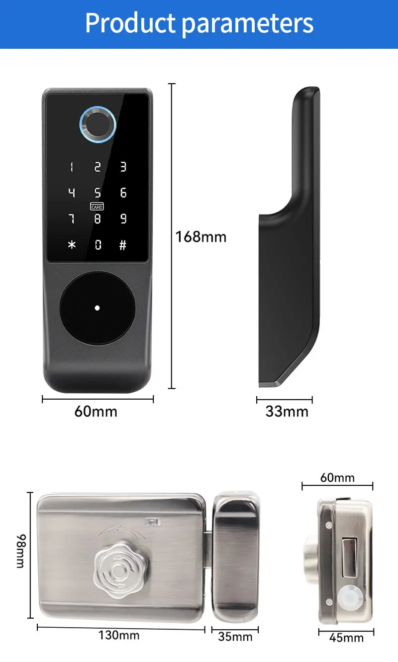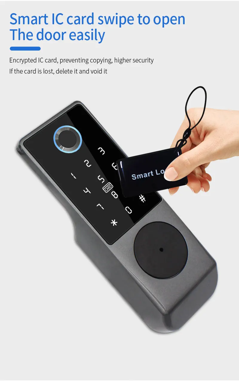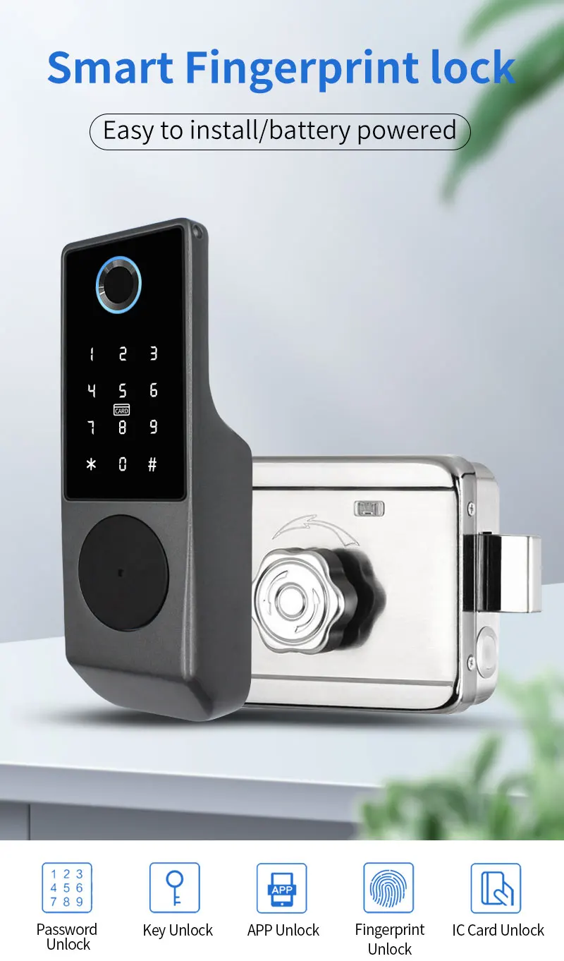 • Entsperrmethoden: Fingerabdruck, Passwort, IC-Karte, App (Tuya/TTLock), Fernbedienung, mechanischer Schlüssel