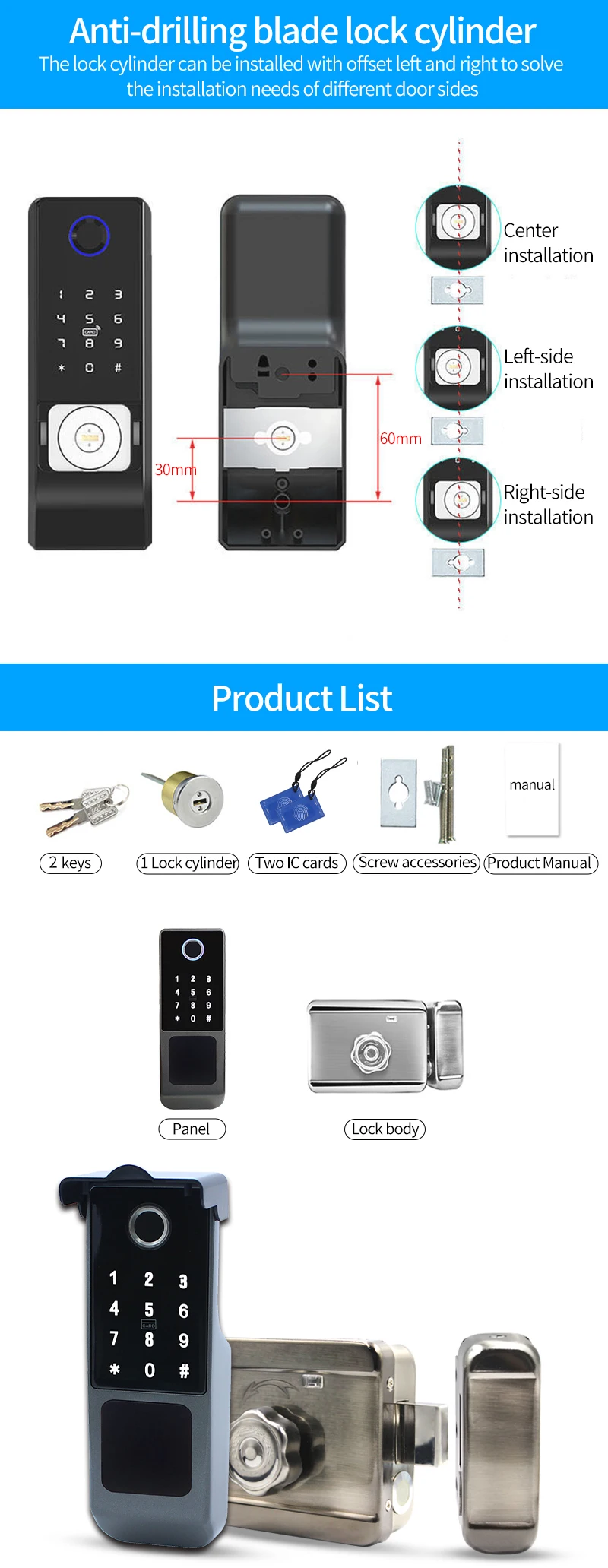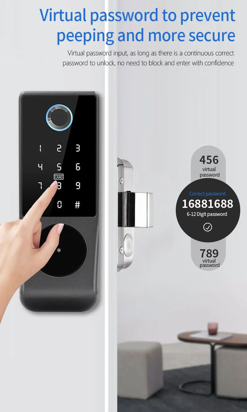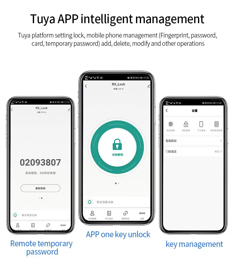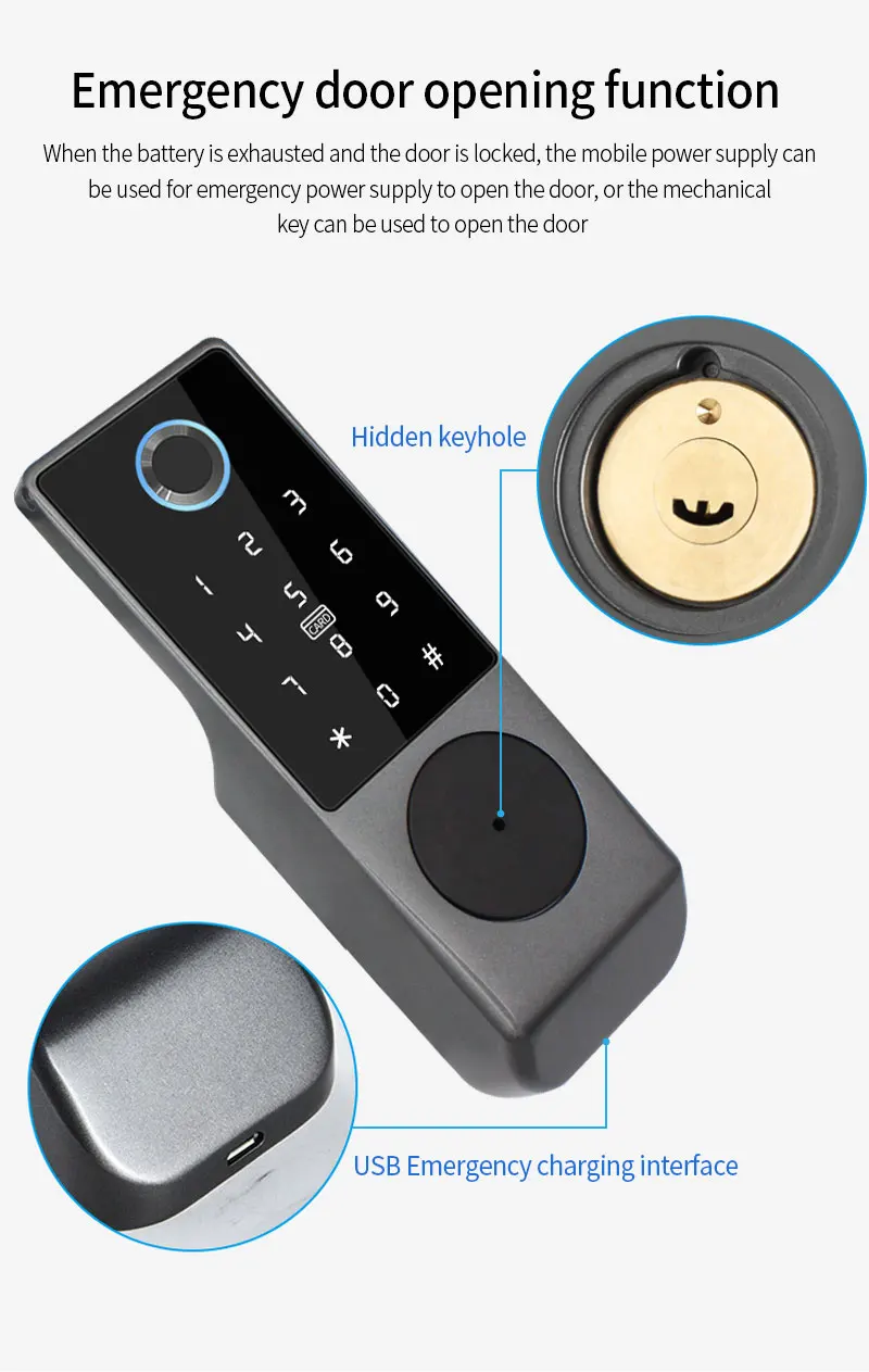• Entsperrmethoden: Fingerabdruck, Passwort, IC-Karte, App (Tuya/TTLock), Fernbedienung, mechanischer Schlüssel