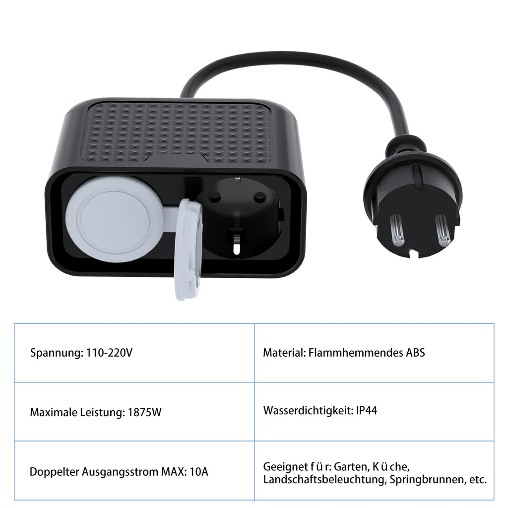 WLAN Außensteckdose IP44 mit Doppelsteckplatz, Timer und Sprachsteuerung – Intelligente Smart Home Steckdose für Garten, Balkon und Terrasse in der Schweiz