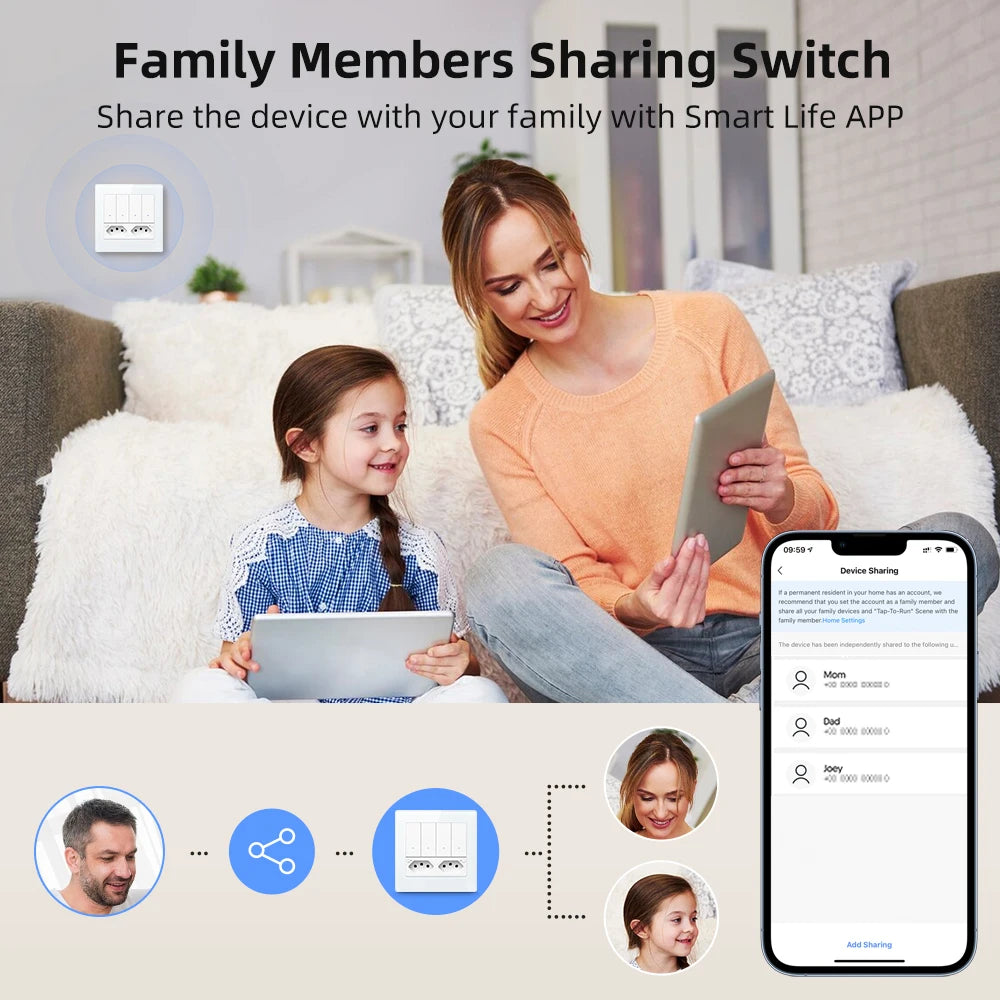 Mit der Smart Life App können Sie den Schalter auch mit Familienmitgliedern teilen, damit jeder Zugriff auf die Steuerung hat. Unterstützt iOS und Android.