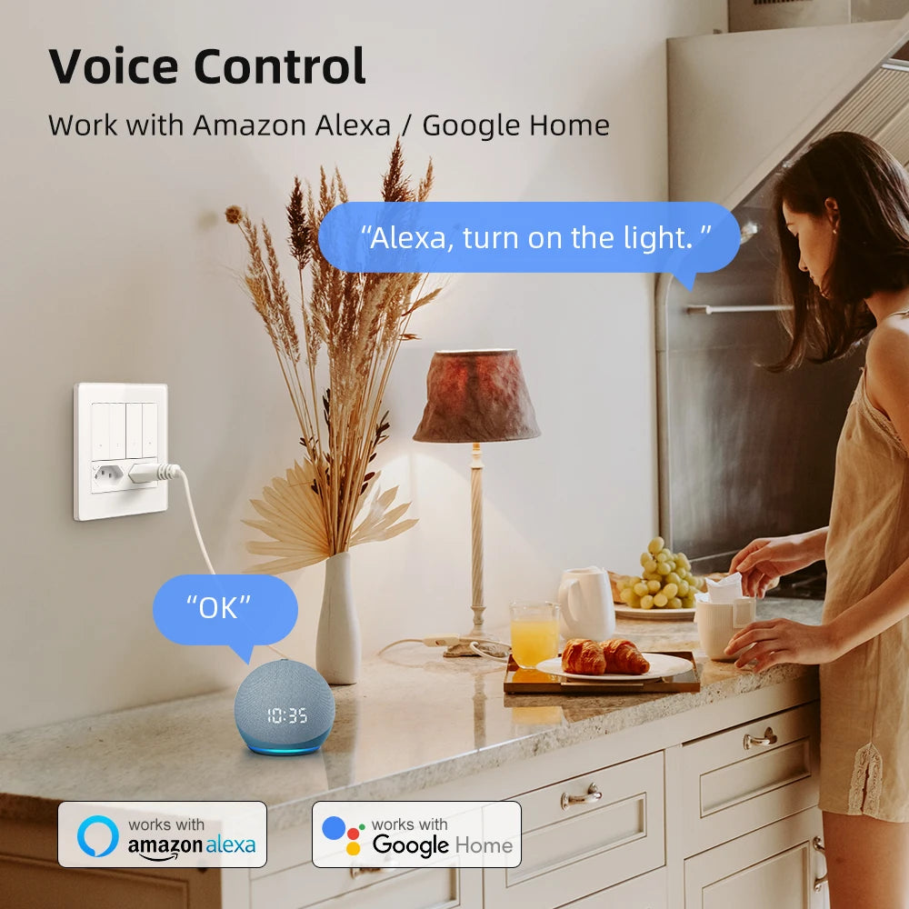 Dieser 4x4 WLAN Smart Schalter mit integrierter Steckdose bietet volle Kontrolle über Ihr Zuhause. Über die Smart Life oder Tuya App können Sie Ihre Beleuchtung und angeschlossene Geräte jederzeit und überall steuern. Kompatibel mit Alexa, Google Home und Yandex Alice für bequeme Sprachsteuerung.