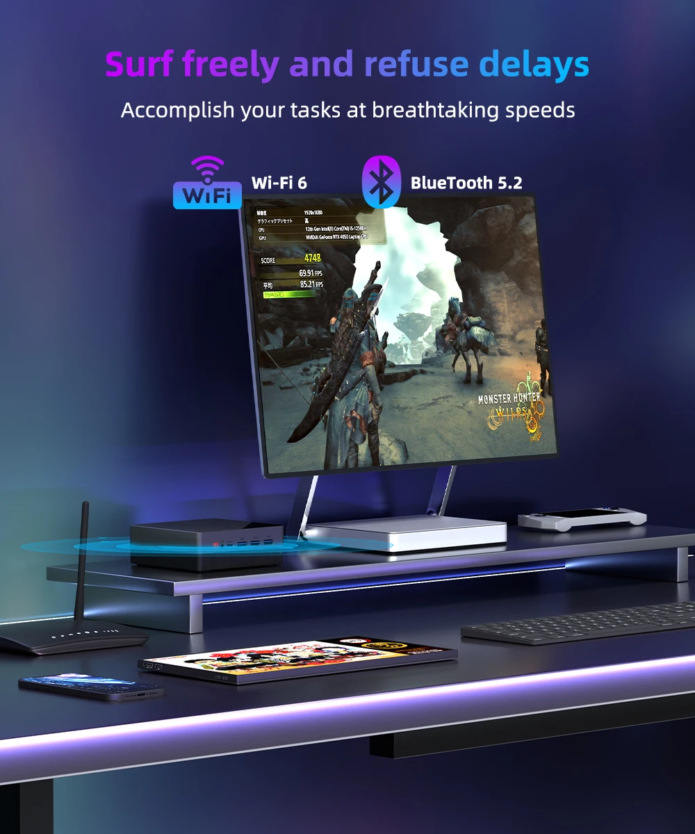 Das kompakte Aluminiumgehäuse ist robust und sorgt für eine gute Wärmeableitung, damit der Mini-PC auch bei längerem Einsatz stabil und leise arbeitet. Die integrierte WLAN 6 und Bluetooth 5.2 Technologie garantiert schnelle und zuverlässige kabellose Verbindungen.